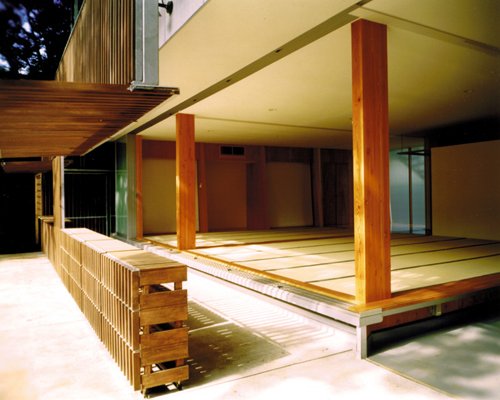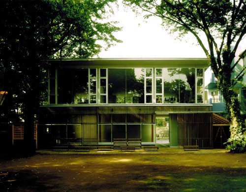 東京の密集した住宅地に位置し、緑豊かな給水場に面している。 神社の境内は15mを超える樹木が茂る「鎮守の森」である。 この計画 では、1階に神社のサポート施設である社務所、 2階には神社の運営 を助ける賃貸オフィスを併設している。 社務所は日常、社殿の背景として静かに佇んでいる存在でありながら 神事となると多様な顔を見せる。 数人から最大60人の氏子が会合を 行う「集会所」、 延べ数百人が訪れる行事(初詣、祭り、餅つき、映画大会など)を準備する「楽屋」、 社殿を引き立たせる「背景」となる。 その多様性に応じる仕掛けとして「開閉式の木格子」を設け、 内 部と外部の関係をつないだり、切り離したりする事により 様々な活動にあわせた規模としつらえを用意する。 1階の社務所は土縁、土間、広間を引き込み式の襖により、 必要に応じて仕切ることができるスペースとしている。 2階のオフィスは両側の樹木に対して大きく開く開口部により、 開放的な執務空間をつくりだしている。 共同設計者 田中幸子/openvision 構造設計者 腰原幹雄/木構造研究所 > 平面図 > 構造図 > 格子解放図