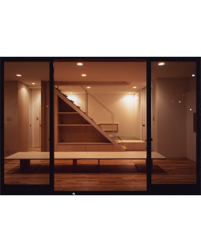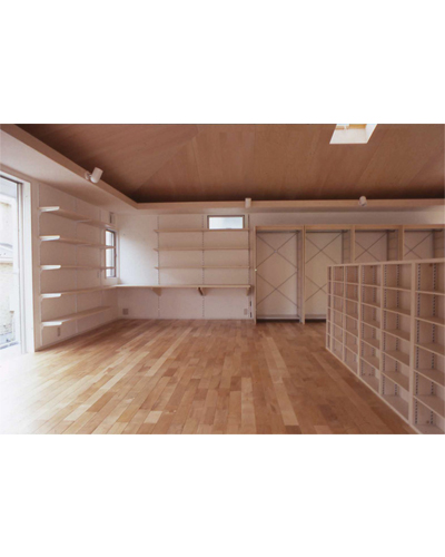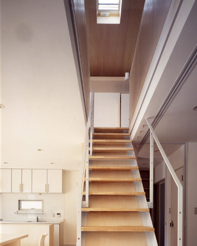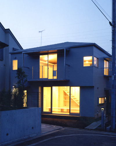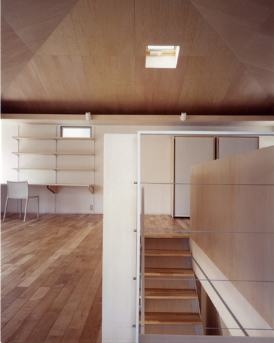 30代の夫婦と小さな女の子のための住宅である。 若い家族の将来の変化に柔軟に対応できる自由度の高い住宅を提案した。 7.35m×7.35mの正方形平面を持つ木造2階建で、 耐力壁を外周部に集約することにより間仕切壁を一切なくしている。 1階には住宅に必要な基本設備や収納を外周部に配置し、 そこに引き込まれる建具によって中央の空間を必要に応じて間仕切ることができる。 また配置や形を変えられる製作家具によって空間の使い方を変更することもできる。 2階は包まれるような方形天井を持つ柱の無い一室空間である。 多様な展開が可能な数種類のユニット家具によって、 一つのスペースを幾通りにも使い分けできるシステムを組み込んでいる。 日々の生活と将来のライフスタイルという時間的スパンの異なる変化に対して、 それぞれの「のびしろ」を用意した住宅である。 共同設計者 田中幸子/openvision 構造設計者 腰原幹雄/木構造研究所 > 平面図 > 構造図