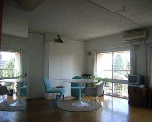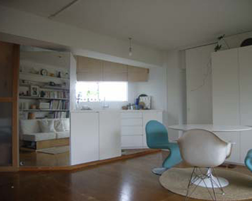 井の頭公園に近接し、緑豊かでありながら駅にも程近いエリアに建つ 古い大規模マンションの一室の改修である。 建物東側5階に位置するこの部屋は教会の中庭に面しており、 庭に育つ樹木は対面する建物からの視線を遮るスクリーンともなり、 穏やかな眺望を得ている。 改修にあたり、既存の床、壁を取払い、 共働きの夫婦のために必要なミニマムなスペースをコンパクトな家具と、 採光や通風を確保 する建具により仕切り、外部の眺望を取り込みながら、 開放感のあるワンルームを作り出している。 > 平面図