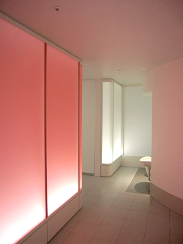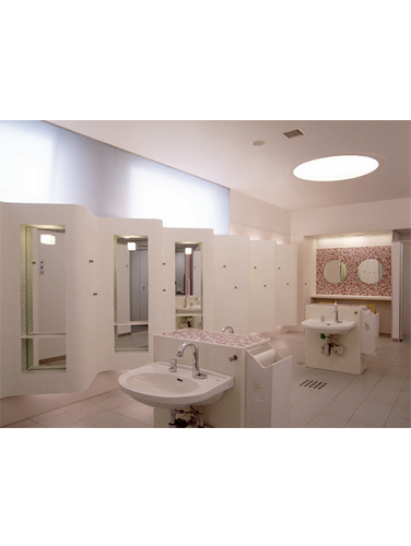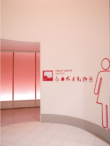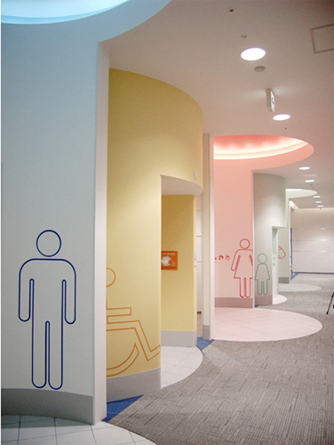 東京近郊の郊外型大規模ショッピングセンター内のトイレの計画である。 このショッピングセンターはユニバーサルデザインに基づいて建築やサインの計画が行われている。 ショッピングセンターのトイレとしての楽しさ、快適さ、 わかりやすさなどに配慮したトイレスペースの提案であり、 様々な人がトイレ内で行う様々なことを気持ちよく行うことができるスペースづくりを目指した。 車椅子やベビーカーを伴っても使用しやすいゆとりのあるスペースを用意し、 体格や状況に合わせて機能が選択できるようにした。 また色彩のコントラストや素材のテクスチャーの違いなどにより、 エリアの違いや器具・扉の位置などを識別しやすくし ている。 共同設計者 田中幸子/openvision > 平面図