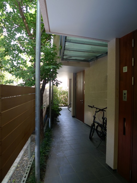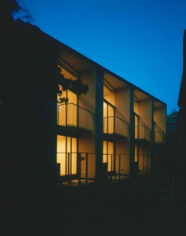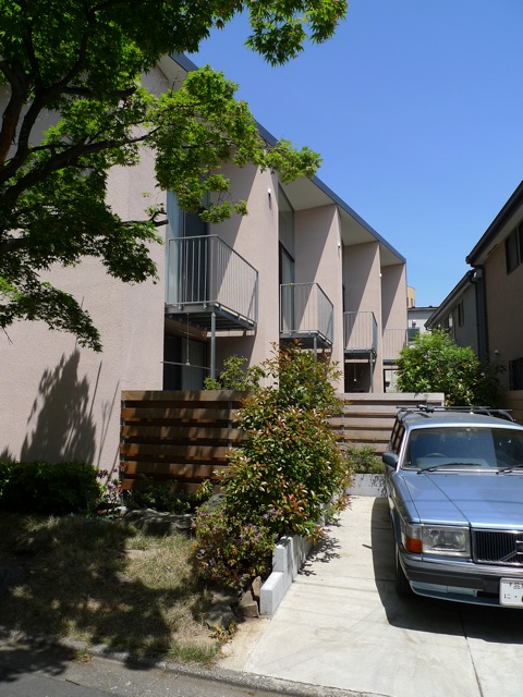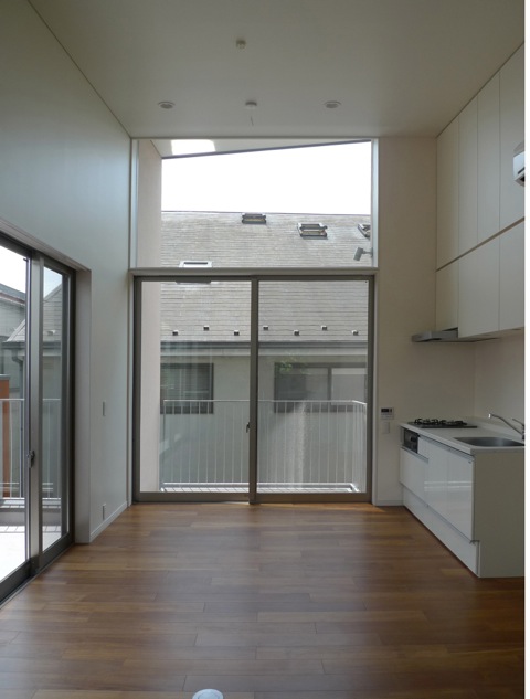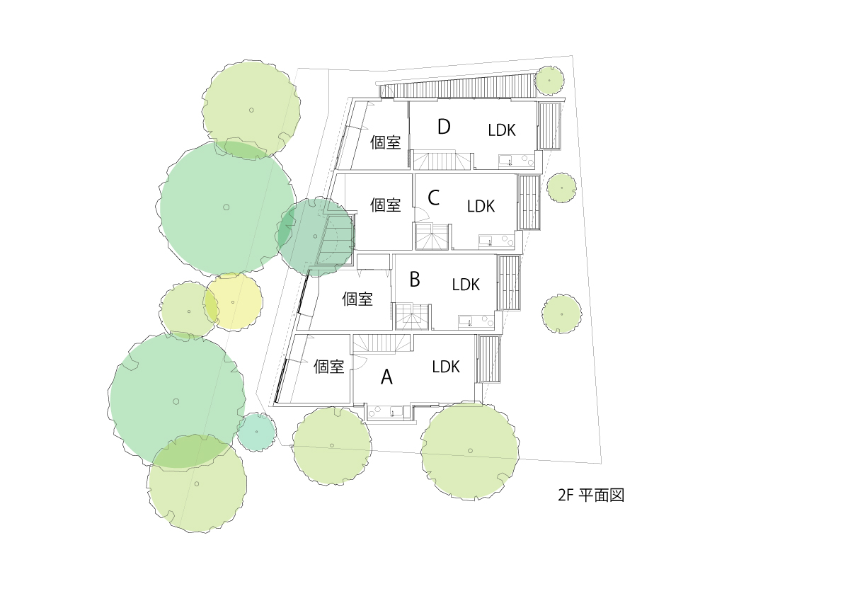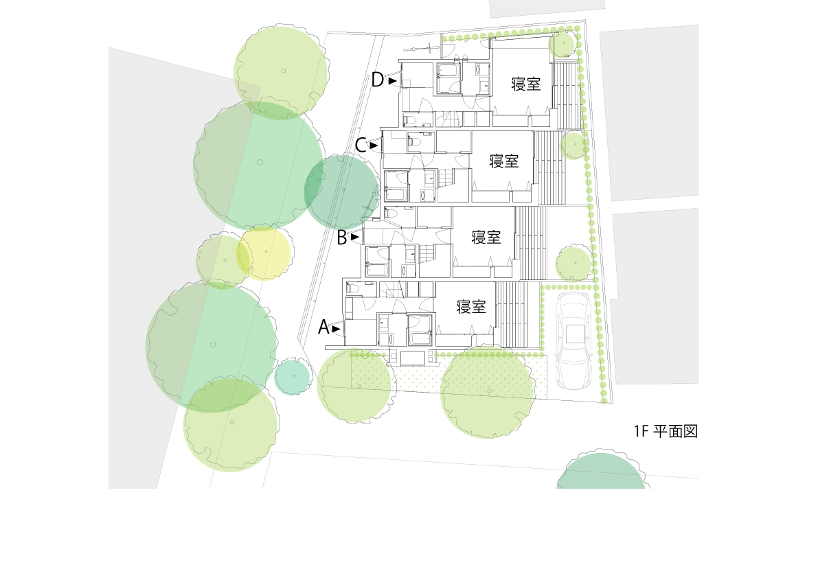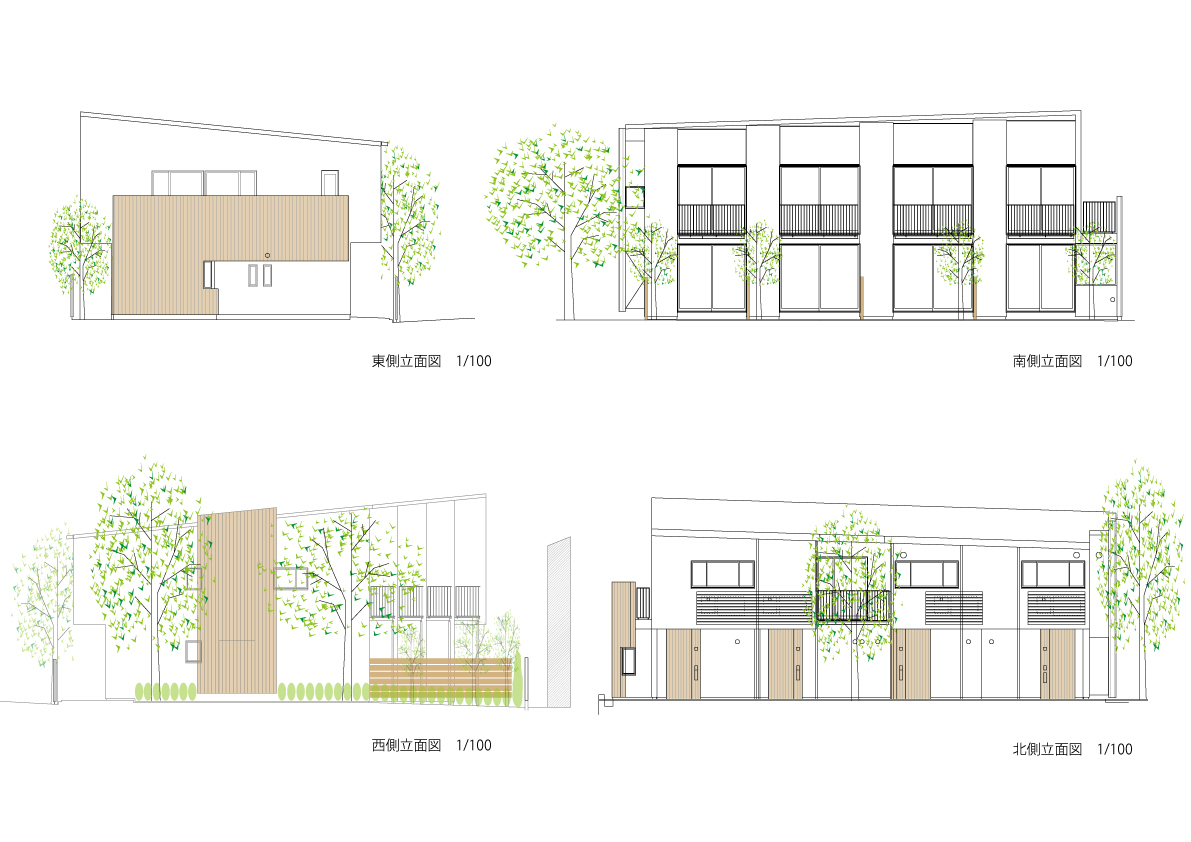 「ポワザ羽根木」は環七と駅に近く、 古くからの樹木が多く残る地域に建つ庭付き賃貸テラスハウスである。 敷地形状を生かした雁行配置により、専有感の高い戸建感覚のプランとなっている。 敷地周囲と専用庭の樹木により、 近隣からの視線を遮りつつ各室内からは緑が見えるよう視線の抜けに配慮した。 2階リビングは高い天井高により、実質以上の開放感を生み出している。 所在地:東京都世田谷区 竣工年:2014年 階数・構造:地上2階、木造軸組工法 面積:敷地面積/ 271.47㎡、建築面積/ 168.25㎡、延床面積/ 268.69㎡ 共同設計:田中幸子/ オープンヴィジョン 構造設計:ハーモニウス一級建築士事務所 撮影:熊谷順 > 平面図(1F) > 平面図(2F) > 立面図