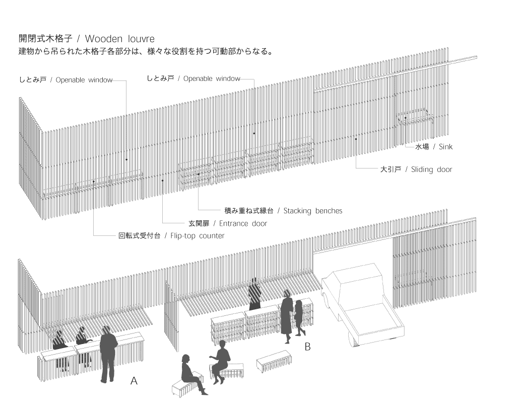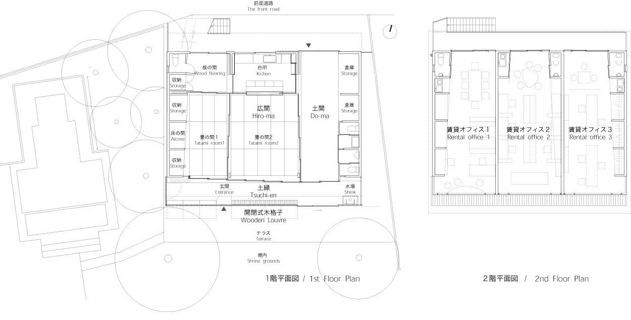 東京の密集した住宅地に位置し、緑豊かな給水場に面している。 神社の境内は15mを超える樹木が茂る「鎮守の森」である。 この計画 では、1階に神社のサポート施設である社務所、 2階には神社の運営 を助ける賃貸オフィスを併設している。 社務所は日常、社殿の背景として静かに佇んでいる存在でありながら 神事となると多様な顔を見せる。 数人から最大60人の氏子が会合を 行う「集会所」、 延べ数百人が訪れる行事(初詣、祭り、餅つき、映画大会など)を準備する「楽屋」、 社殿を引き立たせる「背景」となる。 その多様性に応じる仕掛けとして「開閉式の木格子」を設け、 内 部と外部の関係をつないだり、切り離したりする事により 様々な活動にあわせた規模としつらえを用意する。 1階の社務所は土縁、土間、広間を引き込み式の襖により、 必要に応じて仕切ることができるスペースとしている。 2階のオフィスは両側の樹木に対して大きく開く開口部により、 開放的な執務空間をつくりだしている。 共同設計者 田中幸子/openvision 構造設計者 腰原幹雄/木構造研究所 > 平面図 > 構造図 > 格子解放図