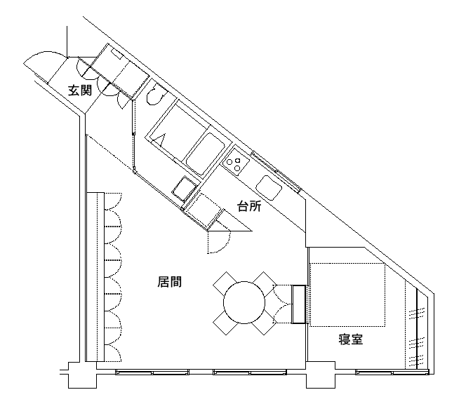 井の頭公園に近接し、緑豊かでありながら駅にも程近いエリアに建つ 古い大規模マンションの一室の改修である。 建物東側5階に位置するこの部屋は教会の中庭に面しており、 庭に育つ樹木は対面する建物からの視線を遮るスクリーンともなり、 穏やかな眺望を得ている。 改修にあたり、既存の床、壁を取払い、 共働きの夫婦のために必要なミニマムなスペースをコンパクトな家具と、 採光や通風を確保 する建具により仕切り、外部の眺望を取り込みながら、 開放感のあるワンルームを作り出している。 > 平面図